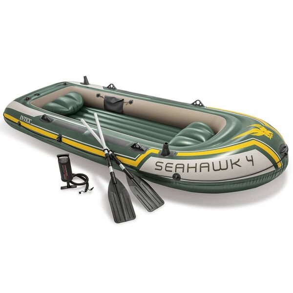 The Intex® Seahawk™ 4 inflatable boat is perfect for four adults to enjoy a fun summer of boating. Whether fishing, relaxing, or rowing on the lake, the Seahawk™ 4 boat is great for making your boating experience exciting and entertaining. Designed with heavy duty, puncture resistant PVC for comfort and durability, and an inflatable I-beam floor for rigidity, the boat contains three air chambers including an inner auxiliary chamber inside the main hull for extra safety. Inflatable cushions are included for comfort and seating stability. Inflating or deflating is a breeze with two quick-fill Boston valves. Fishing and relaxing have never been easier with the two built-in fishing rod holders and gear pouch. Motor mount fittings are included for the flexibility of adding the Intex® motor bracket and trolling motor. A grab handle on the bow and an all-around grab line are provided for your convenience, as well as welded oar locks and oar holders, a U.S. Coast Guard I.D., and a repair patch kit. The Seahawk™ 4 Boat Set provides added accessories including: two 48 inch aluminum oars and an Intex® high-output pump for easy inflation and deflation.